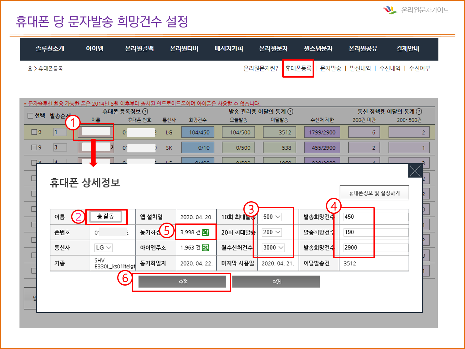 기존과 같이 휴대폰등록관리에서 이름란을 클릭하고 직접 설정해 주시면 됩니다.