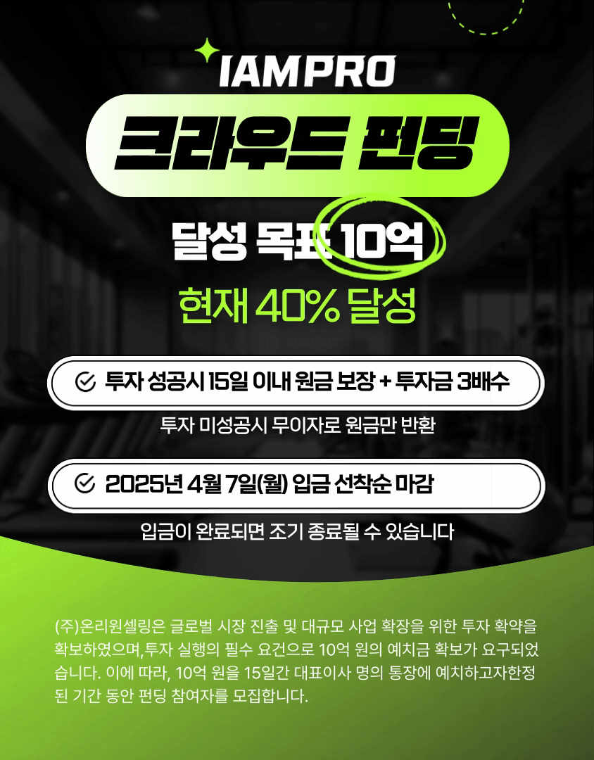 **펀딩 목적 - 투자자 조건 충족을 위한 예치금 10억 원 확보(대표이사 현금유동성 확인용) - 투자 확정 시, 사업 확장 및 수익 분배를 통한 펀딩 참여자 리워드 제공 **리워드 조건 -투자 성공시 15일 이내 원금 보장 + 투자금의 3배수(투자금 입금 완료후) -투자 미성공시 무이자로 원금만 반환한다. **펀딩 일정 2025년 4월 2일(화) ~ 4월 7일(월) 입금선착순 마감 **입금처 국민은행 송조은
